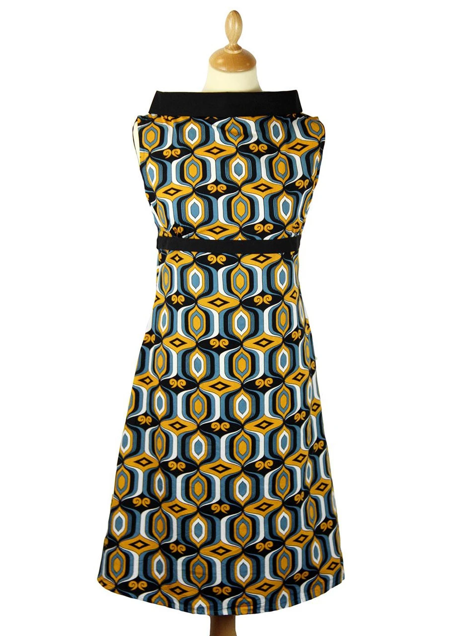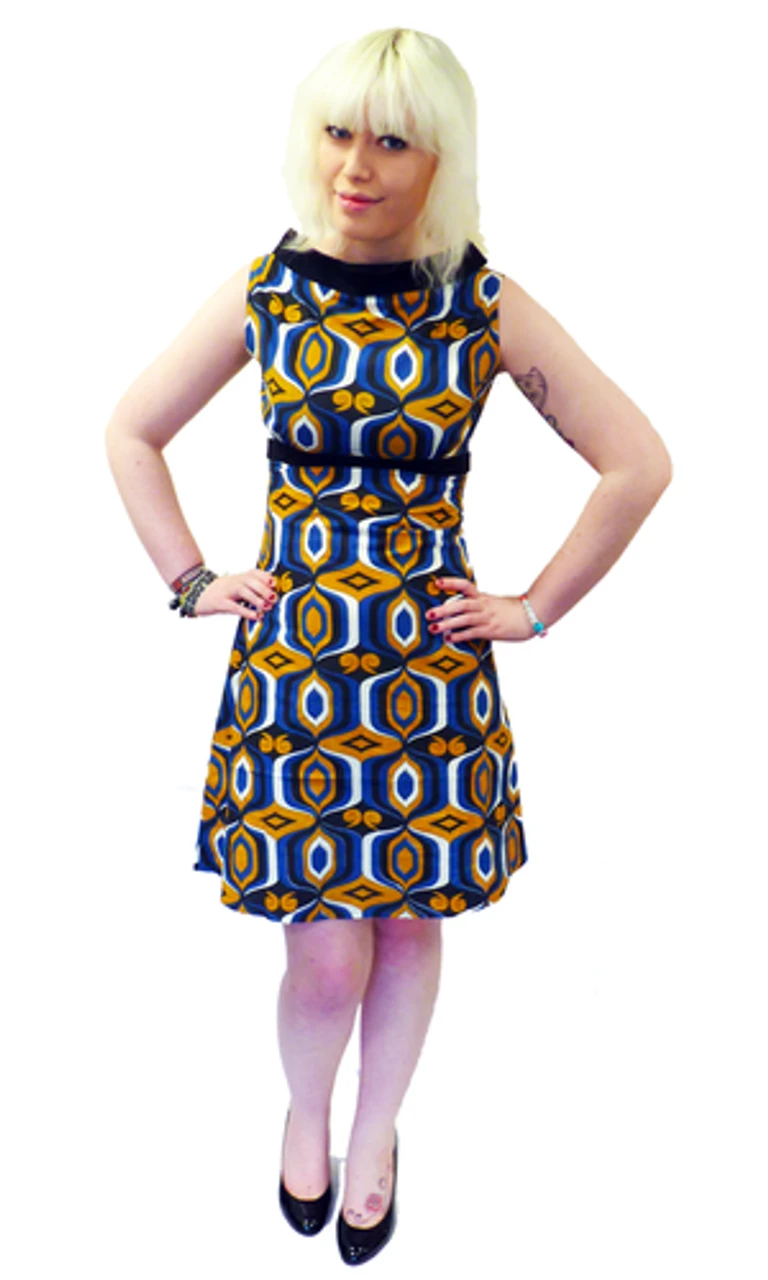 ‘ACE RETRO DRESS’ SIXTIES MOD GEOMETRIC PATTERN A-LINE DRESS by MADCAP ENGLAND – Blue, mustard, black and white Sixties Psychedelic hourglass geo print that creates an elegant Mod A-Line dress. Finished with cool Retro belt tie and folded collar detail. The ‘Ace Retro Dress’ by Madcap England.