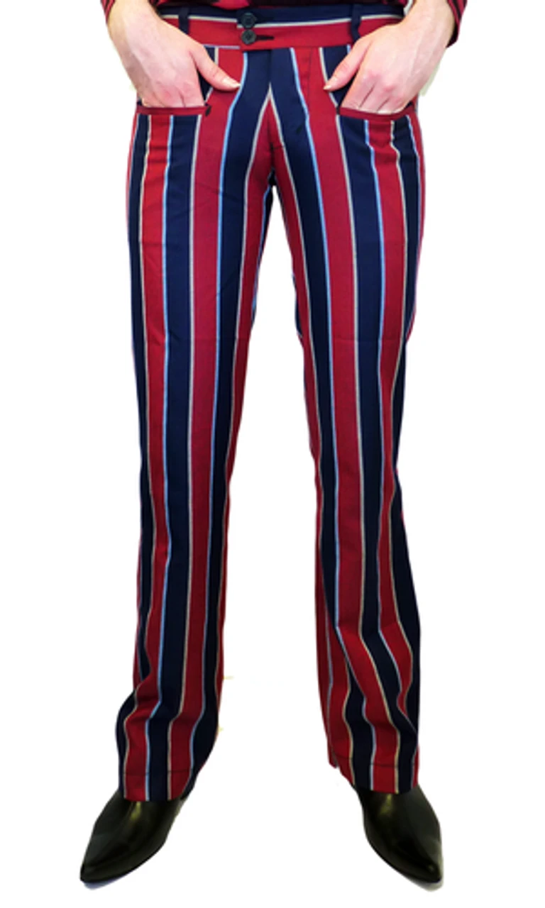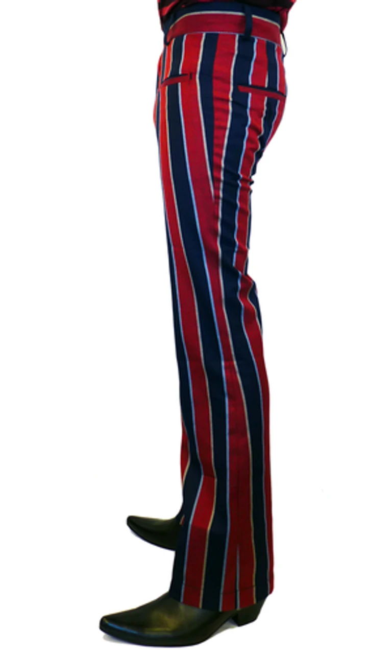 ‘BACKBEAT’ MENS RETRO SIXTIES BLOCK STRIPE BOOTCUT MOD TROSUERS by MADCAP ENGLAND – Mens red and navy Retro block stripe trousers, cleverly separated by off white and sky pinstripes. Horizontal jetted pockets to front and button down jet pockets to reverse. Mod double button waistband. Bootcut bottoms with a contrast diagonal stripe finish to create a Vintage textured look.
