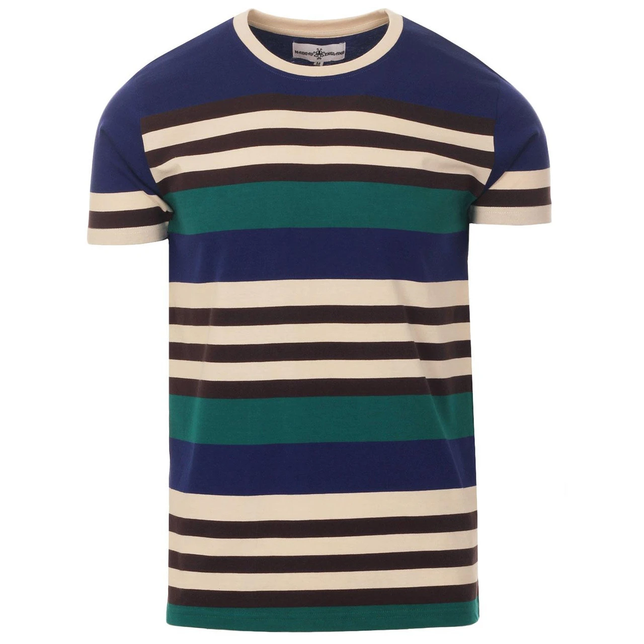 - Madcap England Cosmo men’s retro 70s stripe t-shirt in beacon blue.