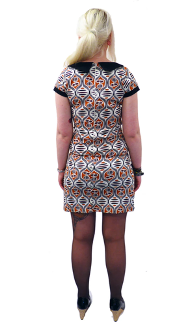 ‘DOLLIEROCKER AZTEC’ RETRO SIXTIES PETER PAN COLLAR MOD DRESS – Ecru, burnt orange, black and brown Mod Aztec print dress with Retro Sixties Peter Pan collar, 3 covered button detail, zip fasten to reverse. Slight stretch to fabric.