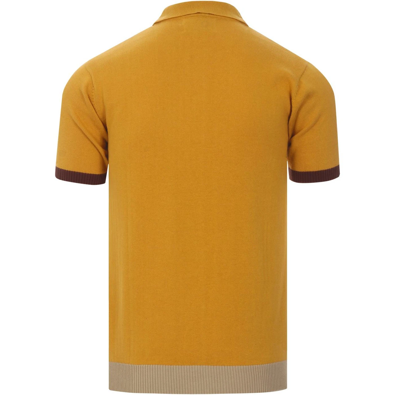 - Madcap England ‘Mercury’ men’s 1960s mod stripe knit polo top in spruce yellow.