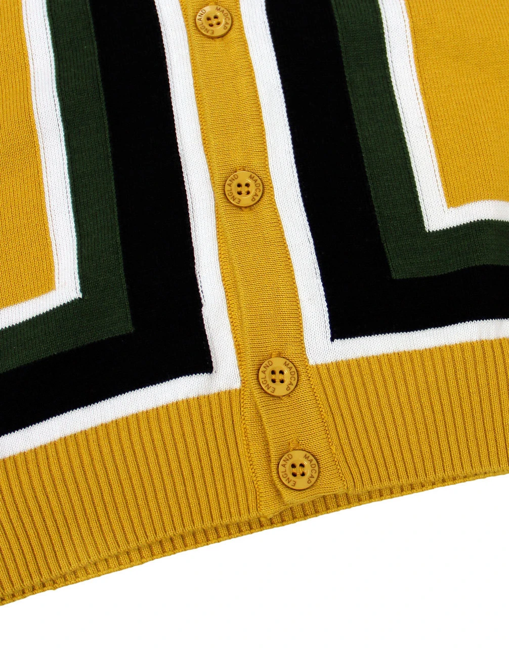 – Madcap England ‘Screamin Jay’ men’s 60s mod square panel stripe polo cardigan.