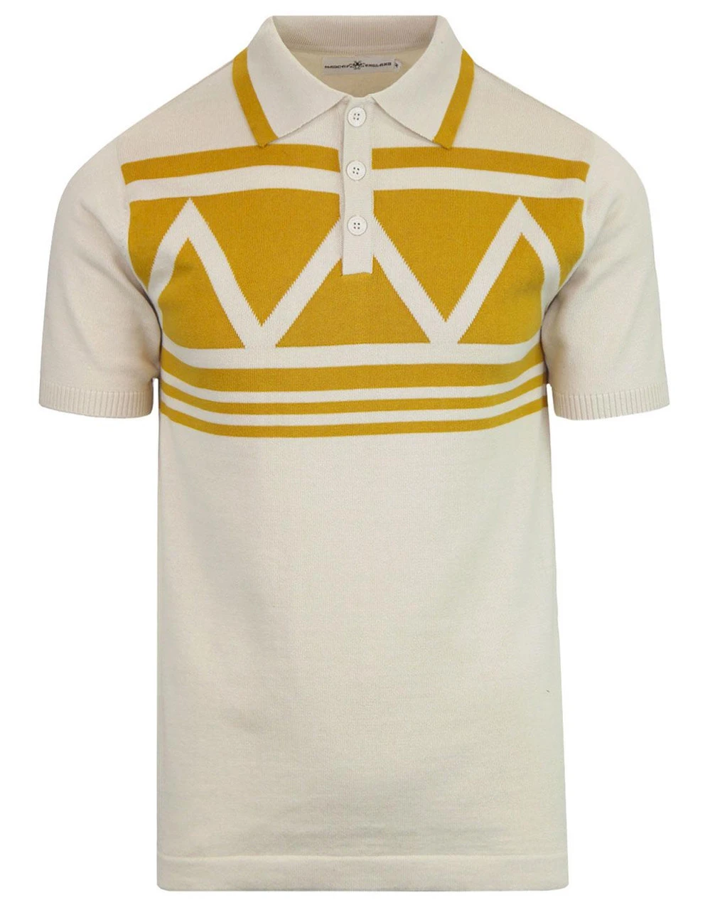 – Madcap England ‘Setting Sun’ men’s retro Aztec knit polo shirt.